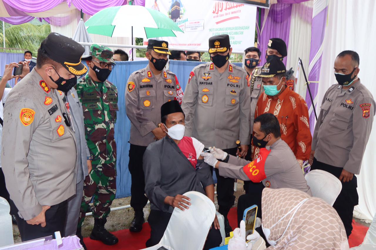 Banda Aceh – Kapolda Aceh Irjen Pol. Drs. Ahmad Haydar, S. H., M. M, dalam kunjungan kerjanya ke Kabupaten Abdya meninjau kegiatan vaksinasi di Kantor Camat Blang Pidie, Abdya, Selasa (26/10/2021).