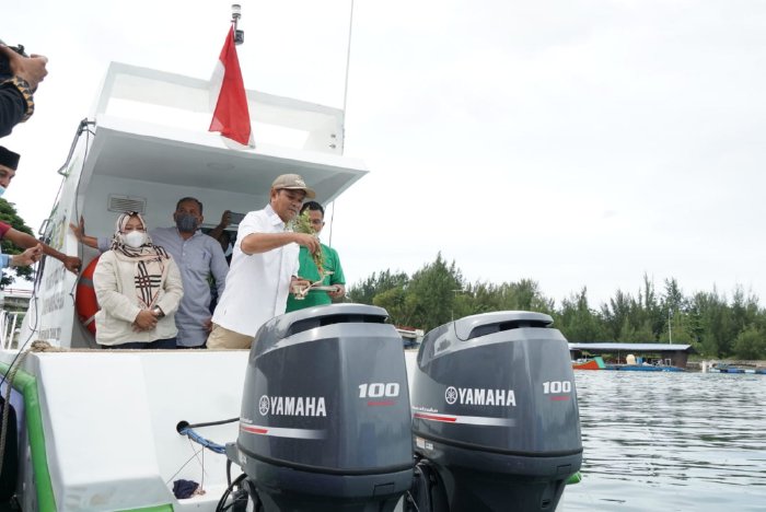 Aceh Besar – Bupati Aceh Besar Ir Mawardi Ali meresmikan (tepung tawar) sekaligus melepaskan 1 unit Ambulance Laut yang akan beroperasi untuk safety publik masyarakat Pulo Aceh, di dermaga Ulee Lheu, Banda Aceh, 29 Oktober 2021.