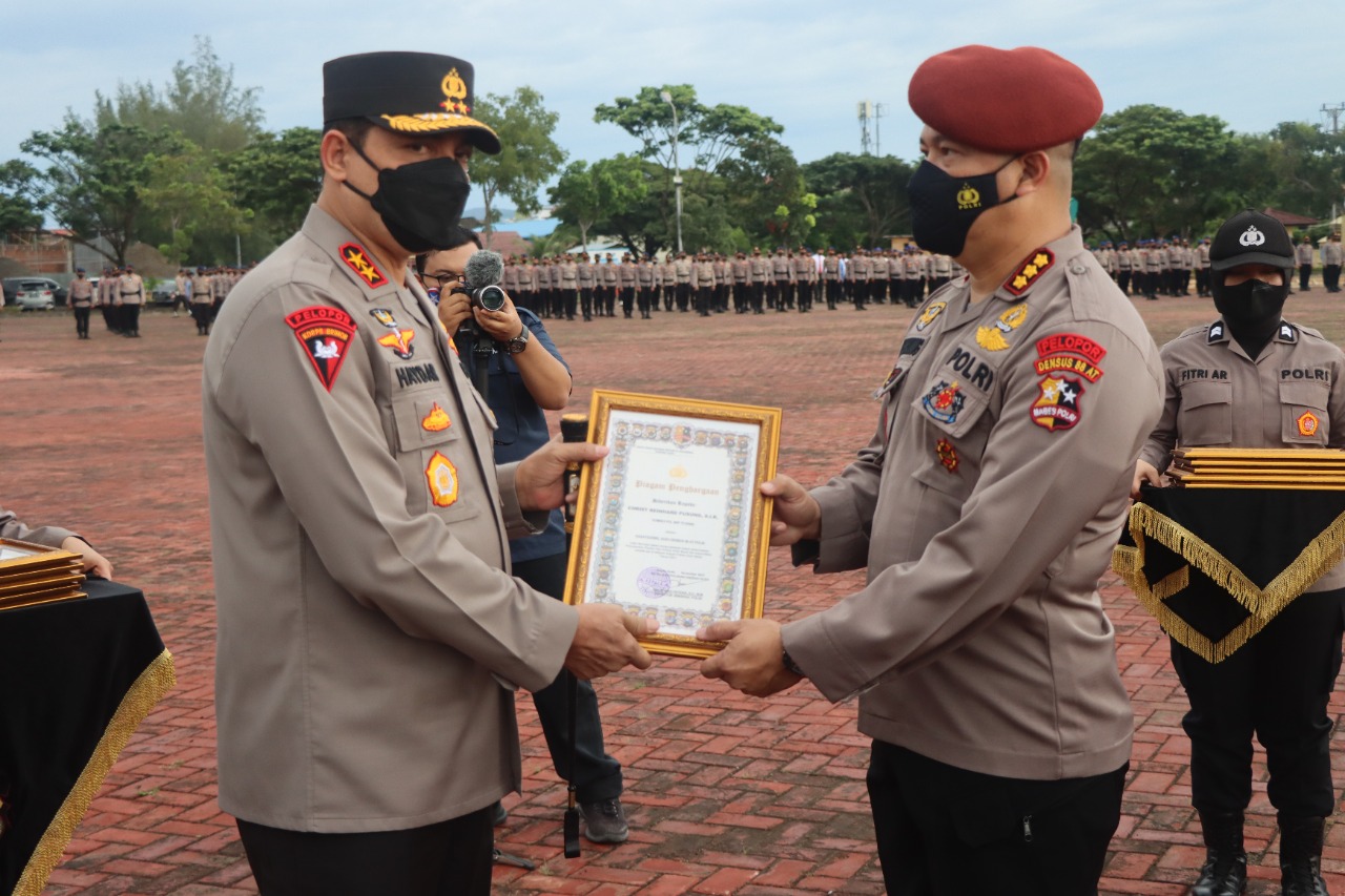 Penyerahan penghargaan itu berlangsung dalam apel pagi yang dipusatkan di Lapangan depan, Mapolda Aceh, Senin, (29/11/21).