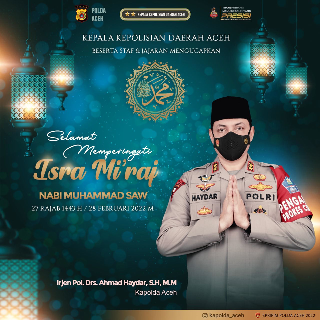 Peringatan Isra Mi’raj ini adalah suatu momentum yang sangat penting bagi umat Islam, karena melalui peristiwa itu diantaranya telah memperlihatkan kebesaran Allah SWT dan perjuangan Nabi Muhamnad S. A. W untuk mewujudkan umat Islam yang taat kepada Allah SWT dan disiplin dengan menunaikan sholat sehari semalam sebanyak 5 waktu, kata Kapolda Aceh Irjen Pol. Drs. Ahmad Haydar, S. H.,M. M, melalui Kabid Humas Polda Aceh Kombes Pol. Winardy, S. H., S. I. K., M. Si, dalam keterangan tertulisnya, Senin (28/2/2022).
