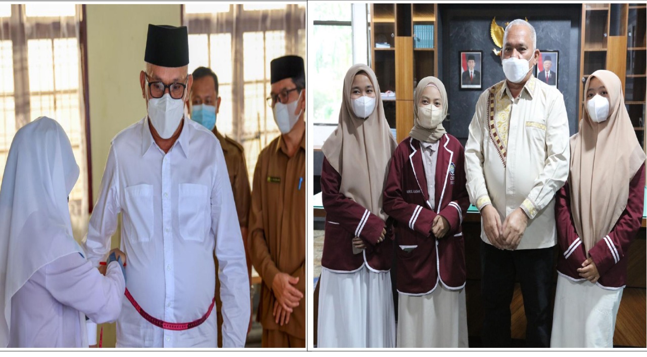 Didampingi Kepala Dinas Pendidikan Aceh, Drs. Alhudri MM, Kepala Cabang Dinas Pendidikan Wilayah Aceh Tengah, Khalidi M.Pd, serta Kepala Sekolah SMKN 1 Takengon, Hajarussalam M.Pd, Zakia bersama dua temannya menyerahkan baju yang telah selesai dijahit langsung kepada Taqwallah, di ruang kerja Sekda Aceh. Kamis, (24/3/2022). Turut hadir saat penyerahan baju itu Asisten III Setda Aceh, Dr. Iskandar, AP