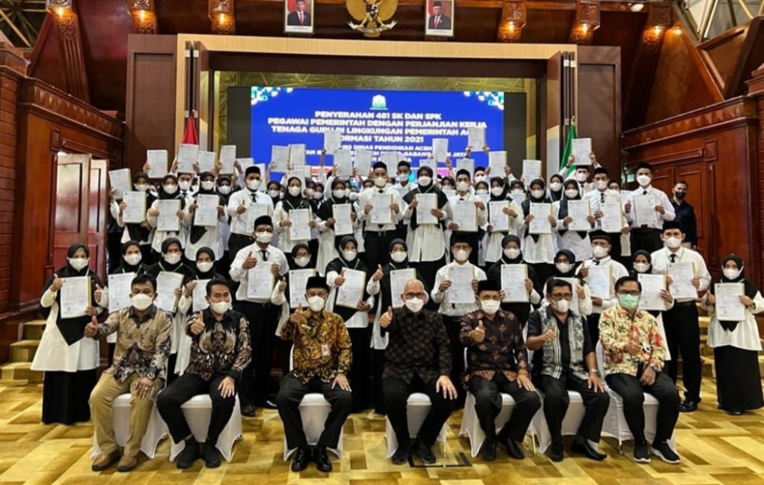 Banda Aceh – Sekretaris Daerah Aceh, dr. Taqwallah, menyerahkan surat keputusan pengangkatan Pegawai Pemerintah dengan Perjanjian Kerja (P3K) kepada 481 guru Sekolah Menengah Atas (SMA), Sekolah Menengah Kejuruan (SMK) dan Guru Sekolah Luar Biasa (SLB). Mereka berasal dari Kota Banda Aceh, Aceh Besar, Sabang, Aceh Jaya, Pidie dan Pidie Jaya.