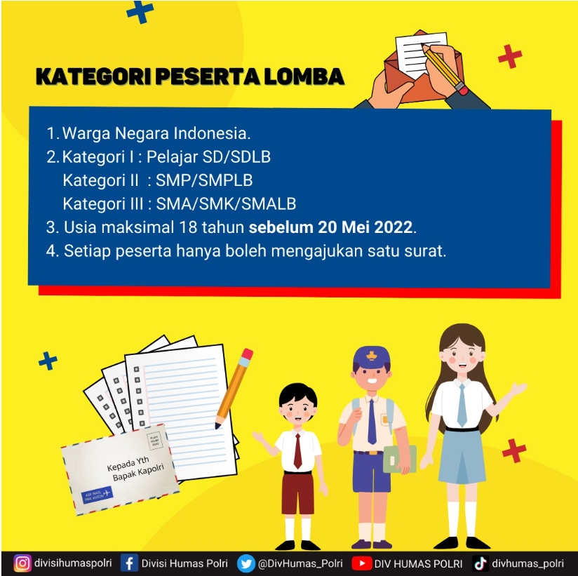 Dijelaskan Kabid Humas Kombes Pol. Winardy, S. H., S. I. K., M. Si, dalam siaran persnya, Rabu (25/5/2022) bahwa lomba menulis surat untuk Kapolri 2022 itu digelar untuk kalangan pelajar  dengan kategori peserta meliputi merupakan warga negara RI, kategori I dari pelajar SD/SDLB, kategori II dari SMP/SMPLB dan kategori III dari SMA/SMK/SMALB, kemudian berusia maksimal 18 tahun sebelum 20 Mei 2022 dan setiap peserta hanya boleh mengajukan satu surat.