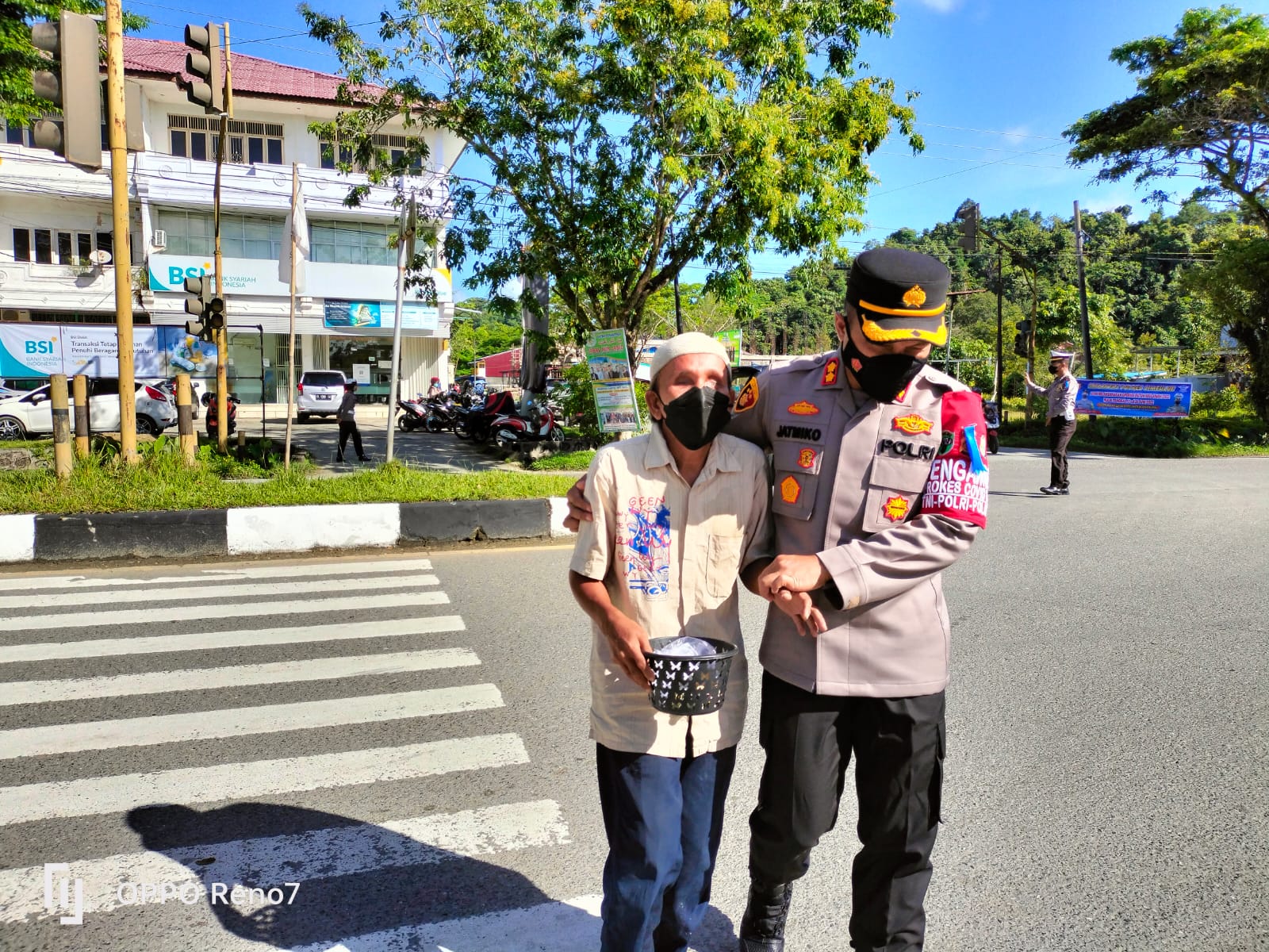 Banda Aceh – Kapolres Simeulue AKBP Jatmiko, S. H., M. H, membantu seorang kakek tua tunanetra saat hendak menyeberangi jalan raya di Kota Sinabang, Simeulue, Senin (13/6/2022) pagi.