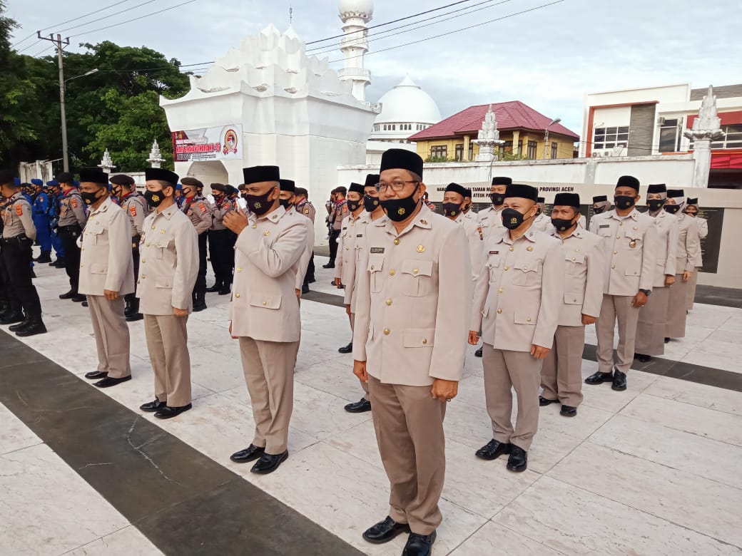 Banda Aceh – Sejumlah PNS Polda Aceh mengikuti upacara ziarah di Taman Makam Pahlawan (TMP) Banda Aceh, Rabu (29/6/2022) pagi.