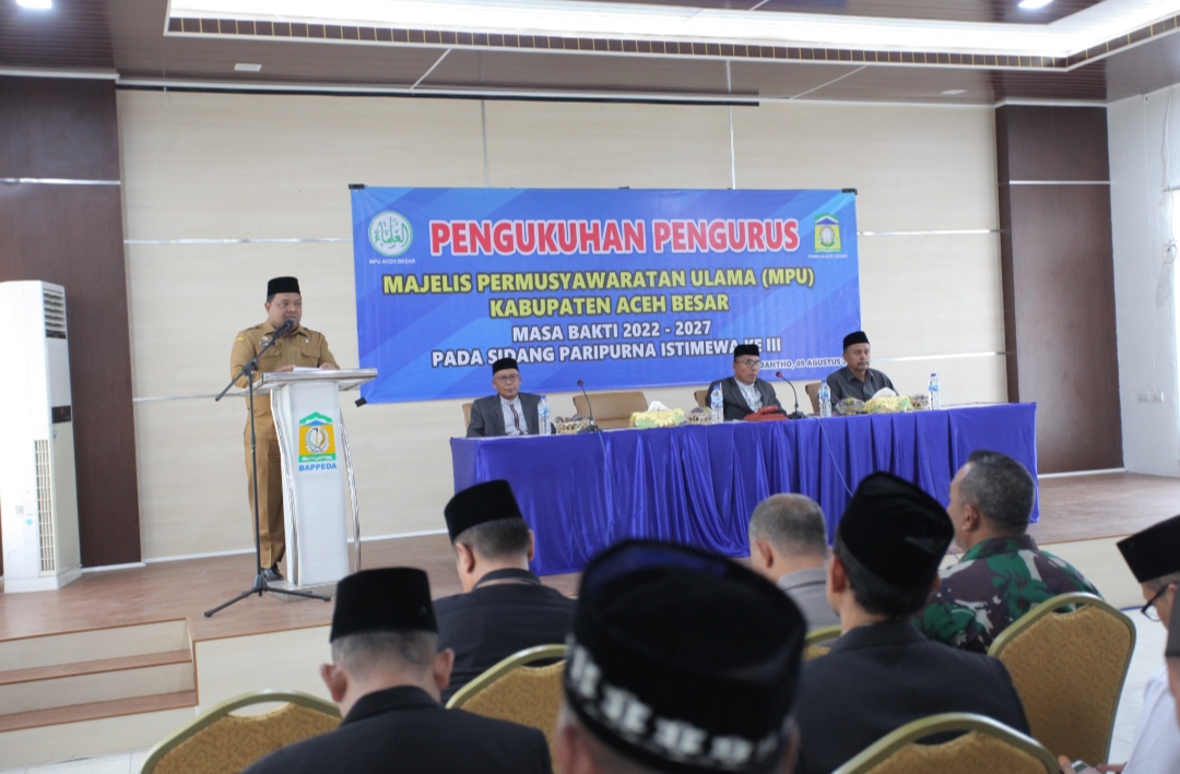 Aceh Besar – Sebanyak 31 orang Pengurus Majelis Permusyawaratan Ulama (MPU) Kabupaten Aceh Besar periode 2022-2027 dikukuhkan di Aula Kantor Bappeda Kabupaten Aceh Besar, Selasa (9/8/2022). Pengukuhan dipandu langsung oleh Ketua MPU Aceh Besar sebelumnya, Tgk H Nasruddin M. Dari 31 anggota MPU Aceh Besar yang dikukuhkan itu, sebanyak 8 orang merupakan utusan kabupaten serta 23 orang lainnya merupakan utusan kecamatan.