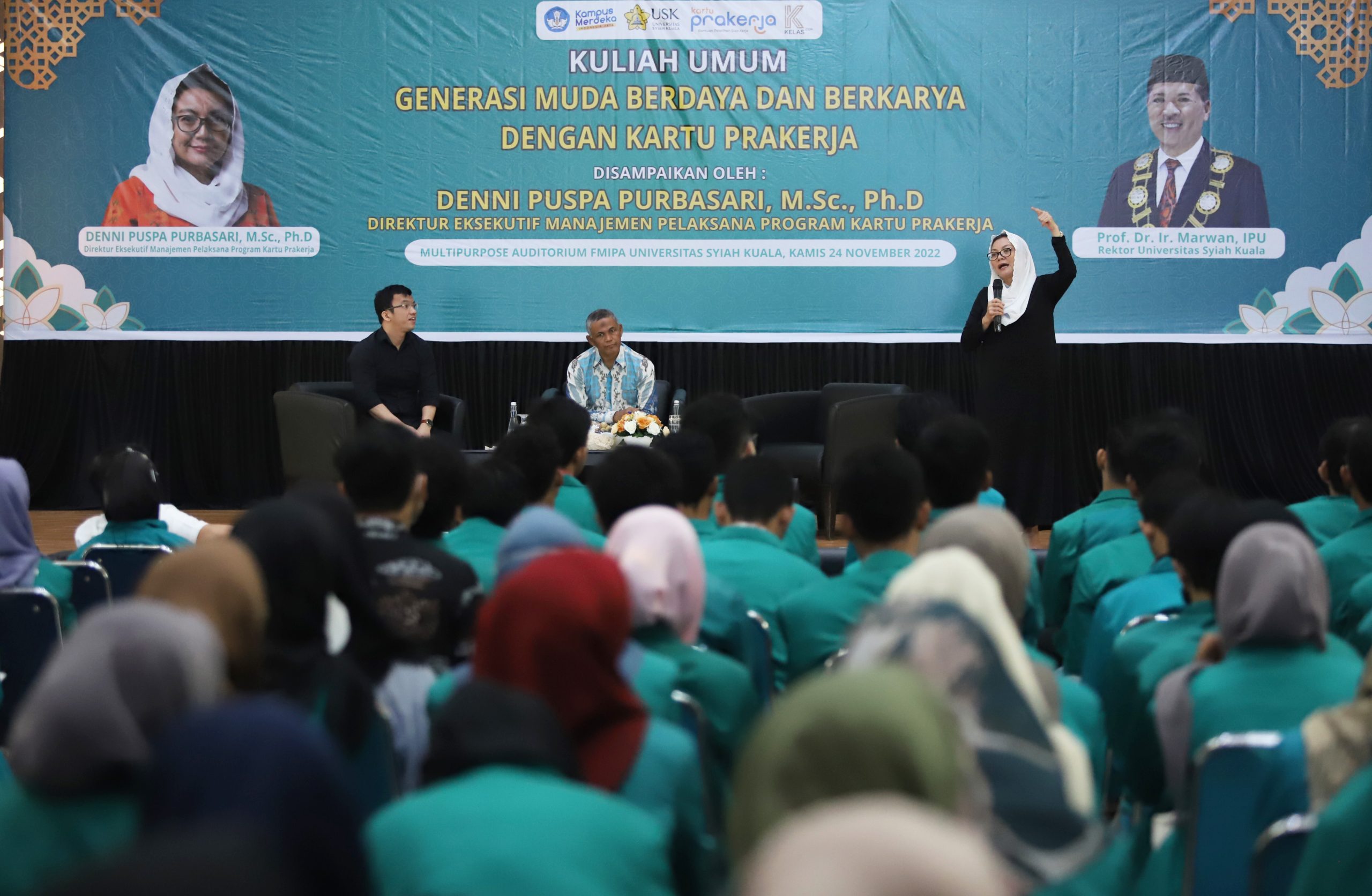 Banda Aceh – Direktur Eksekutif Manajemen Pelaksana Program Kartu Prakerja Denni Puspa Purbasari, M.Sc., Ph.D memberikan motivasi kepada ratusan mahasiswa Universitas Syiah Kuala untuk terus berkarya dan meningkatkan kompetensinya.