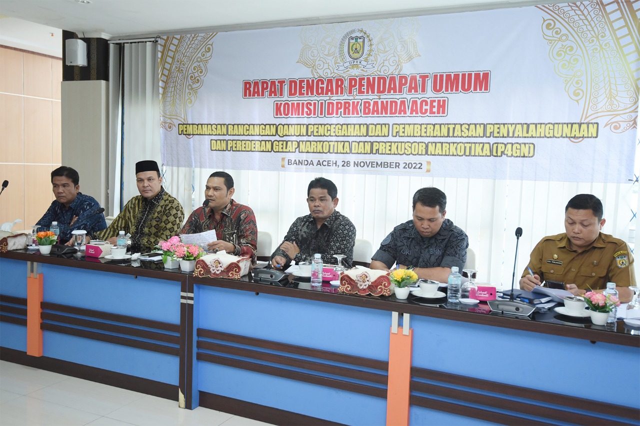 Banda Aceh – Komisi I Dewan Perwakilan Rakyat Kota (DPRK) Banda Aceh menggelar rapat dengar pendapat umum (RDPU) tentang Rancangan Qanun (Raqan) Pencegahan dan Pemberantasan Penyalahgunaan dan Peredaran Gelap Narkotika dan Prekusor Narkotika (P4GN) yang berlangsung di lantai empat gedung DPRK Banda Aceh, Senin (28/11/2022).