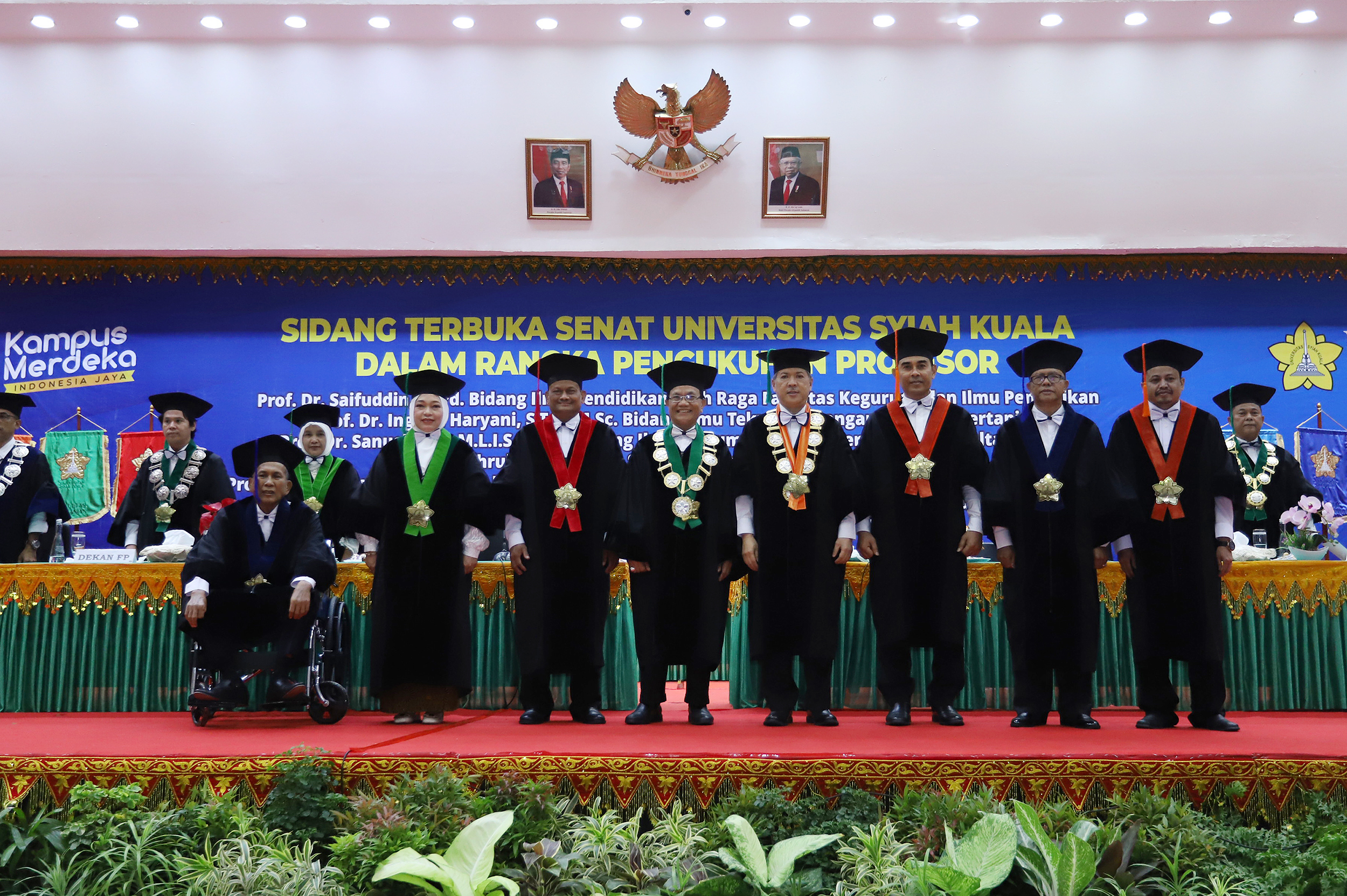 Mereka yang dikukuhkan kali ini adalah Prof. Dr. Saifuddin, M.Pd, Prof. Dr. Ing. Sri Haryani, S.T.P., M.Sc, Prof. Dr. Sanusi, S.H., M.L.I.S., LL.M, Prof. Dr. Zahrul Fuadi, S.T., M.Sc, Prof. Dr. Drs. Yusri Yusuf, M.Pd dan Prof. Dr. Ing. Teuku Edisah Putra, M.Sc., Ph.D.
