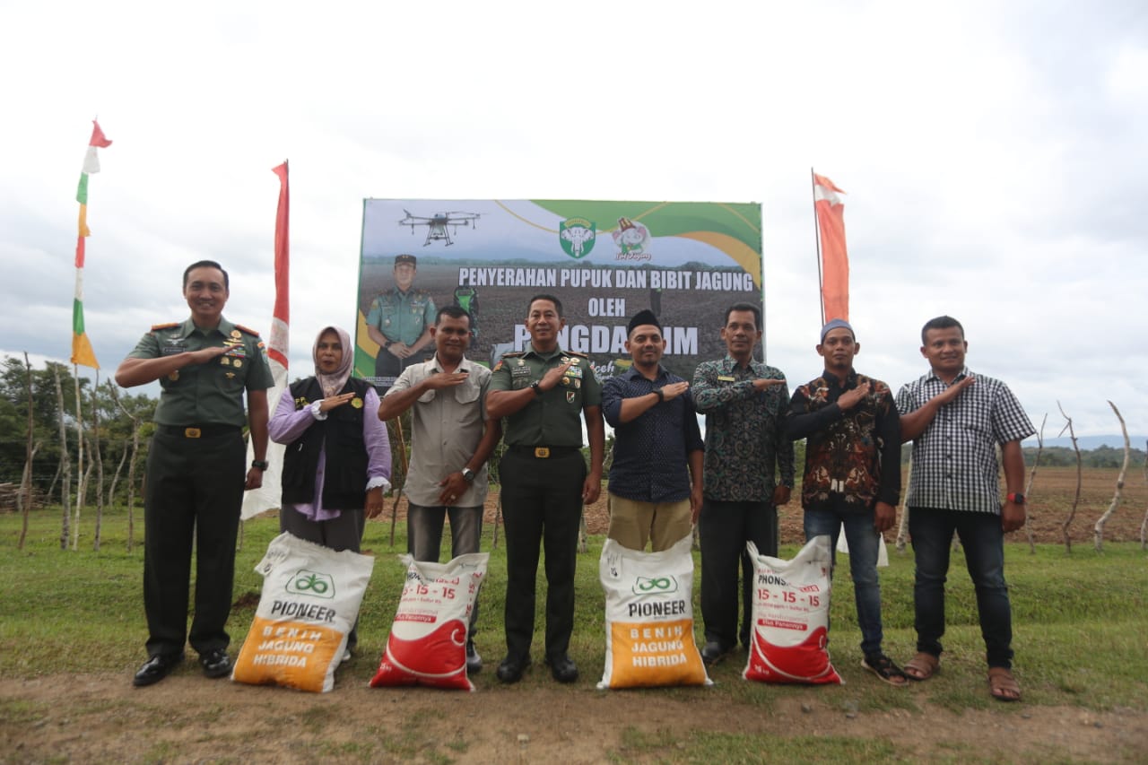 Aceh Besar — Panglima Komando Daerah Militer Iskandar Muda (Pangdam IM) Mayor Jenderal TNI Novi Helmy Prasetya, S.I.P, M.I.P, menggelar acara penyerahan bibit jagung dan pupuk di Dusun Blang, Desa Siron Blang, Kecamatan Kuta Cot Glie, Kabupaten Aceh Besar, Sabtu (25/11/2023).