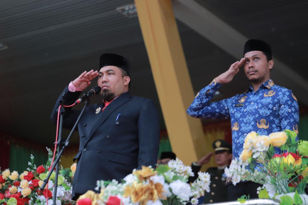 Kota Jantho – Penjabat (Pj) Bupati Aceh Besar Muhammad Iswanto SSTP MM bertindak selaku Inspektur Upacara (Irup) Hari Ulang Tahun Korpri ke-52 dan Hari Guru Nasional serta HUT PGRI ke-78 tahun 2023 di Lapangan Bungong Jeumpa Kota Jantho, Rabu (29/11/2023).