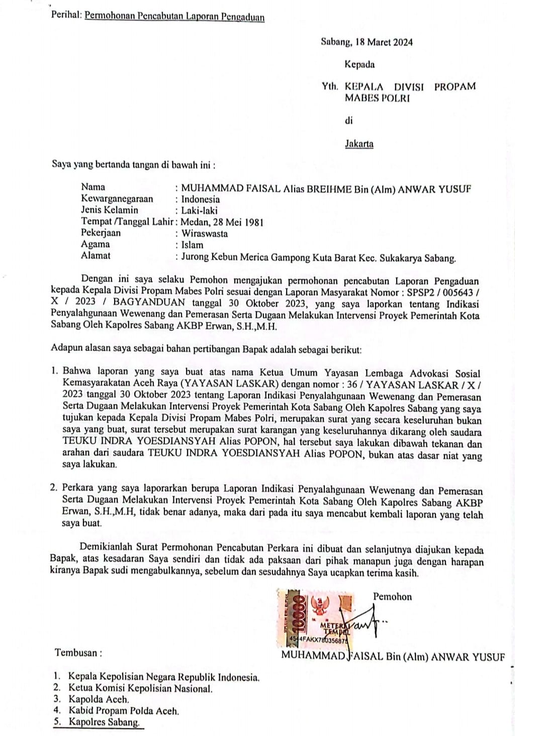 Oleh karena itu, atas kesadaran sendiri Faisal mencabut laporan tersebut. Ia membuat dan mengirimkan surat secara resmi kepada Kepala Divisi Propam Mabes Polri pada tanggal 18 Maret 2024 untuk mencabut laporan terhadap Kapolres Sabang AKBP Erwan, SH., MH. Surat tersebut dibuat dan ditandatangani atas meterai cukup.