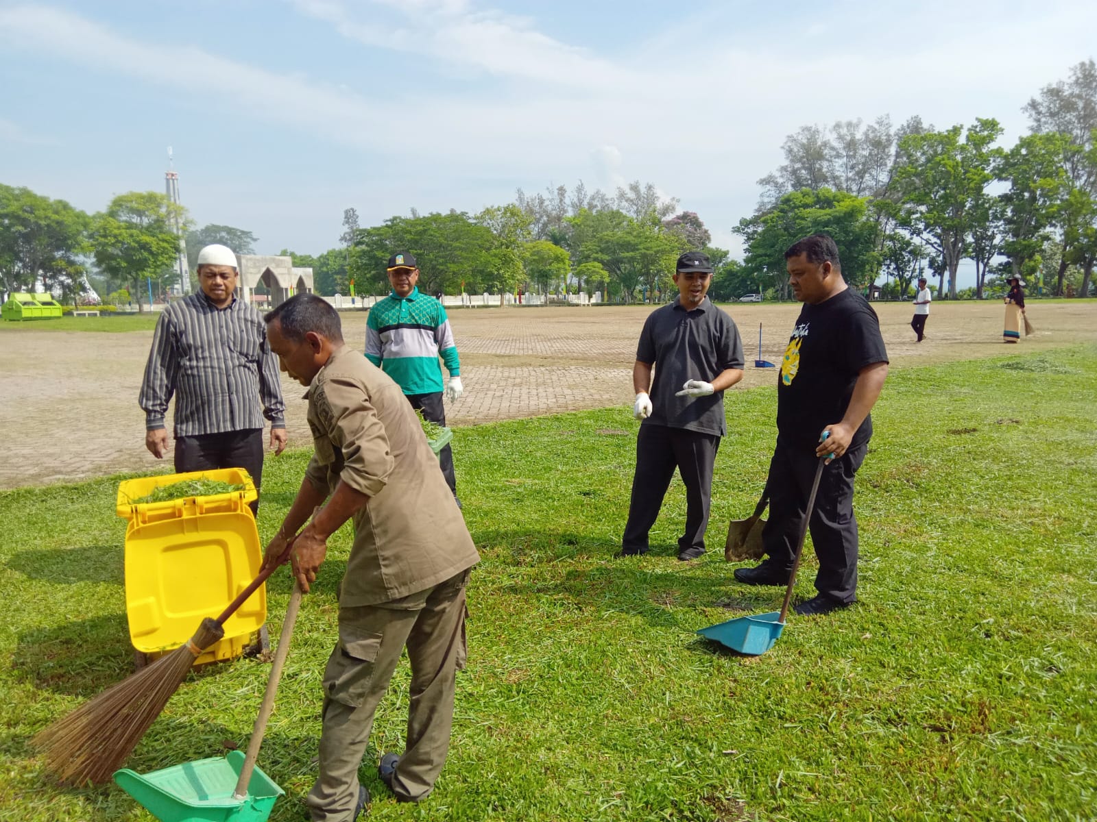 Para pejabat dan Aparatus Sipil Negara (ASN) serta tenaga kontrak dijajaran Pemerintah Kabupaten (Pemkab) Aceh Besar melakukan gotong royong, di lapangan Bungoeng Jeumpa Kota Jantho, Selasa (30/4/2024). FOTO : MC ACEH BESAR