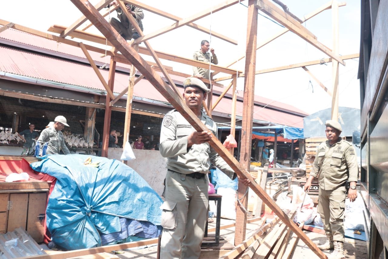 Kota Jantho –Tim gabungan dari Satuan Polisi Pamong Praja (Satpol PP) Kabupaten Aceh Besar bersama TNI/ Polri berserta Dinas Koperasi, UKM dan Perdagangan (Disperindagkop) melakukan penertiban terhadap pedagang dan bangunan liar yang berada di Pasar Induk Lambaro, Kecamatan Ingin Jaya, Kabupaten Aceh Besar, Ingin Jaya, Selasa (07/05/2024).