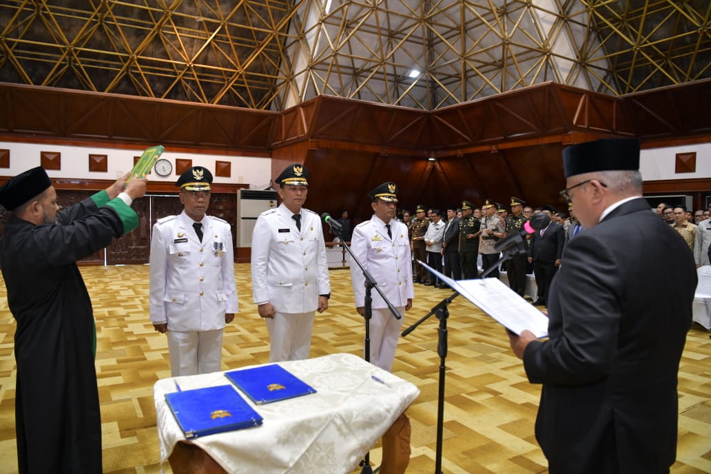 Banda Aceh – Penjabat Gubernur Aceh Bustami Hamzah, atas nama Presiden RI, mengambil Sumpah Jabatan dan Melantik Pj Bupati Pidie, Pj Bupati Gayo Lues, dan Pj Wali Kota Sabang, di Anjong Mon Mata Komplek Meuligoe Gubernur Aceh, Kamis (18/7/2024) sore.