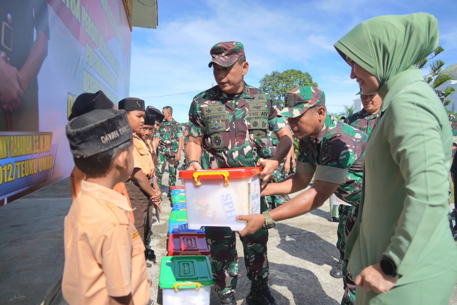 Dalam acara tersebut, Danrem 012/TU didampingi istri, Ny. Rina Benny Rahadian menyerahkan tali asih yang berisi paket sembako kepada anak-anak yatim. Penyerahan tersebut dilakukan dengan penuh kehangatan dan kepedulian.