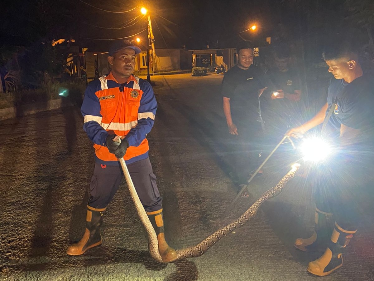 Tim Damkar BPBD Aceh Besar Evakuasi Ular Piton Sepanjang Tiga Meter