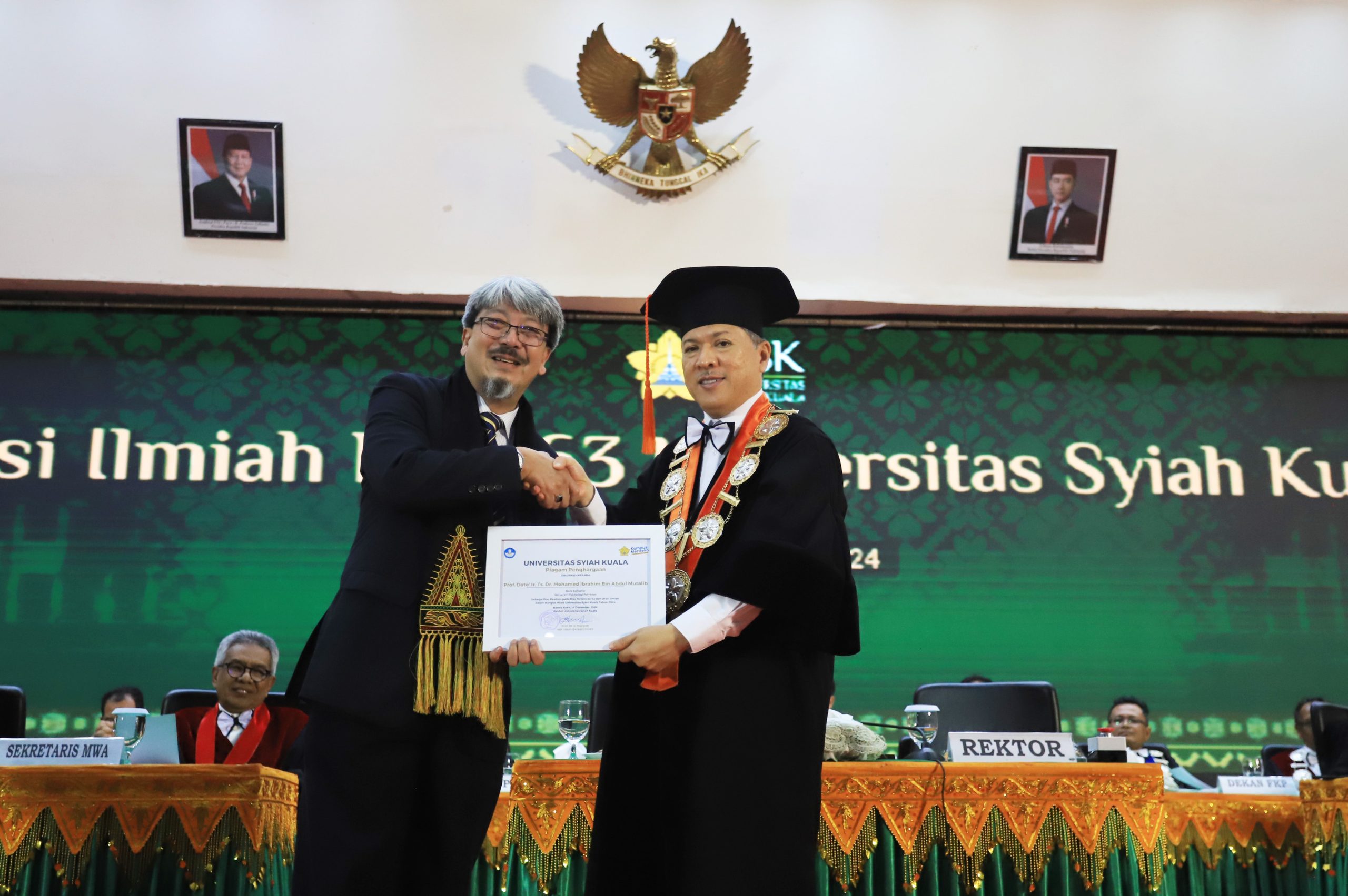 Rektor USK menyerahkan sertifikat penghargaan kepada Vice Chancellor Universiti Teknologi PETRONAS, Prof. Dato‘ Ir. Ts. Dr Mohamed Ibrahim Abdul Mutalib usai menyampaikan orasi ilmiah pada peringatan Milad ke-63 USK di Gedung AAC Dayan Dawood, Banda Aceh, Sabtu (14/12/2024). Foto: Humas USK.