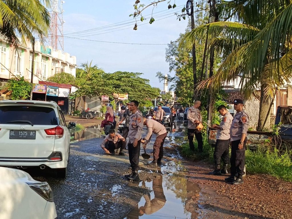 Banda Aceh – Cegah terjadinya kecelakaan di daerah Krueg Barona Jaya, Aceh Besar yang disebabkan jalan berlubang, Kepala Kepolisian Sektor (Kapolsek) Krueng Barona Jaya AKP Winarto bersama Personel bergerak cepat untuk menambal jalan berlubang di area tersebut, Jumat (7/3/2025).