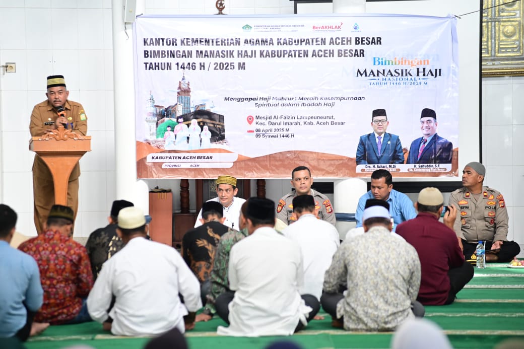 Aceh Besar – Bupati Aceh Besar diwakili Asisten II Bidang Perekonomian dan Pembangunan Sekdakab Aceh Besar, H.M Ali SSos MSi membuka secara resmi bimbingan manasik haji Kabupaten Aceh Besar tahun 1446 H/2025 M di Masjid Al Faizin Lampeuneurut, Darul Imarah, Aceh Besar, Selasa (8/4/2025).