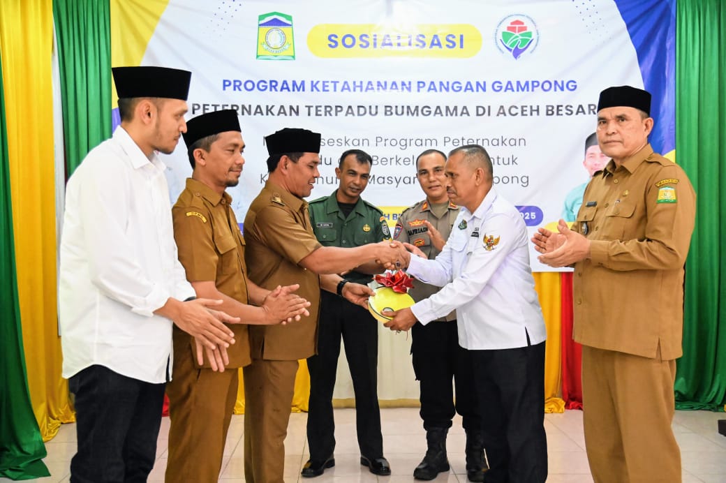 Aceh Besar – Bupati Aceh Besar H. Syech Muharram Idris membuka sosialisasi program ketahanan pangan melalui Peternakan Terpadu Badan Usaha Milik Gampong Bersama (BUMGAMA) di Aula UDKP Sukamakamur, Aceh Besar, Selasa (8/4/2025).