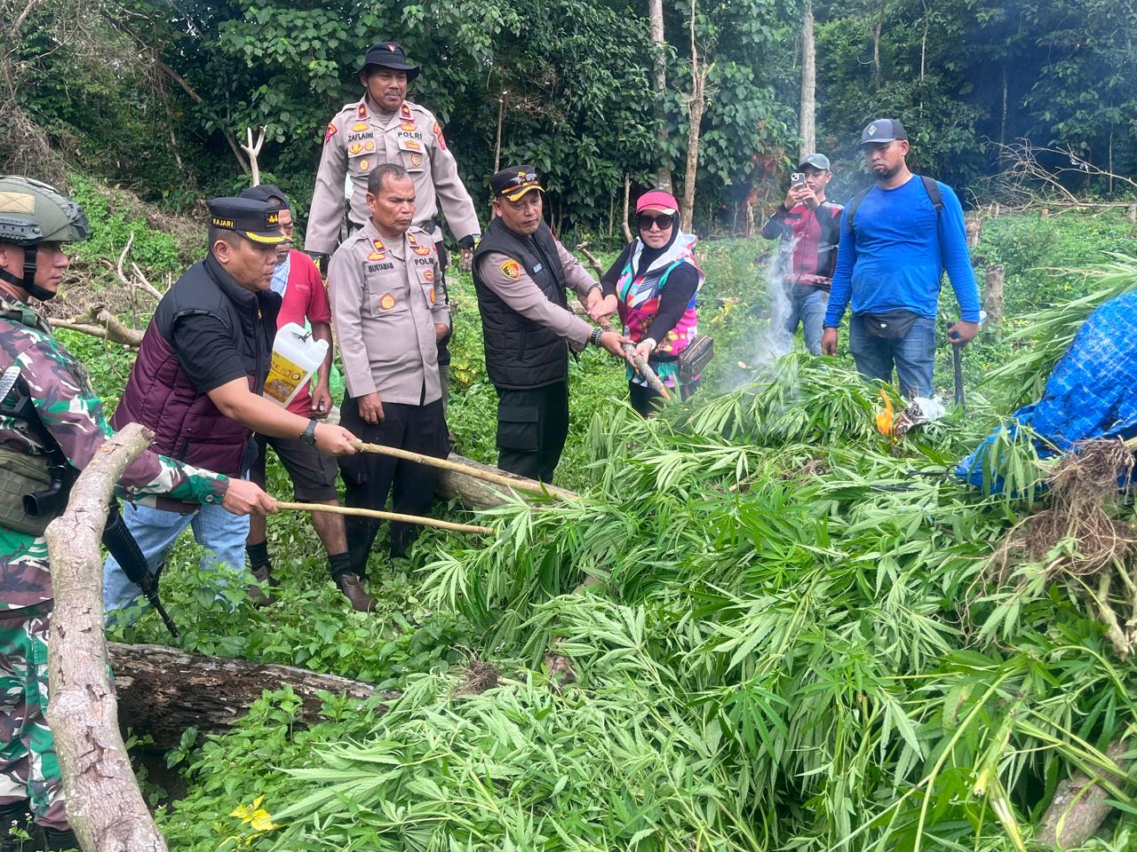 Setelah tiba lokasi kemudian dilanjutkan dengan pemusnahan ladang ganja yang ditemukan kurang lebih 1000 (Seribu) batang dengan tinggi batang 1 sampai 2 Meter dengan usia tanam diperkirakan 2 hingga 3 Bulan dilahan seluas 1 hektar dengan cara dibakar di lokasi penemuan.