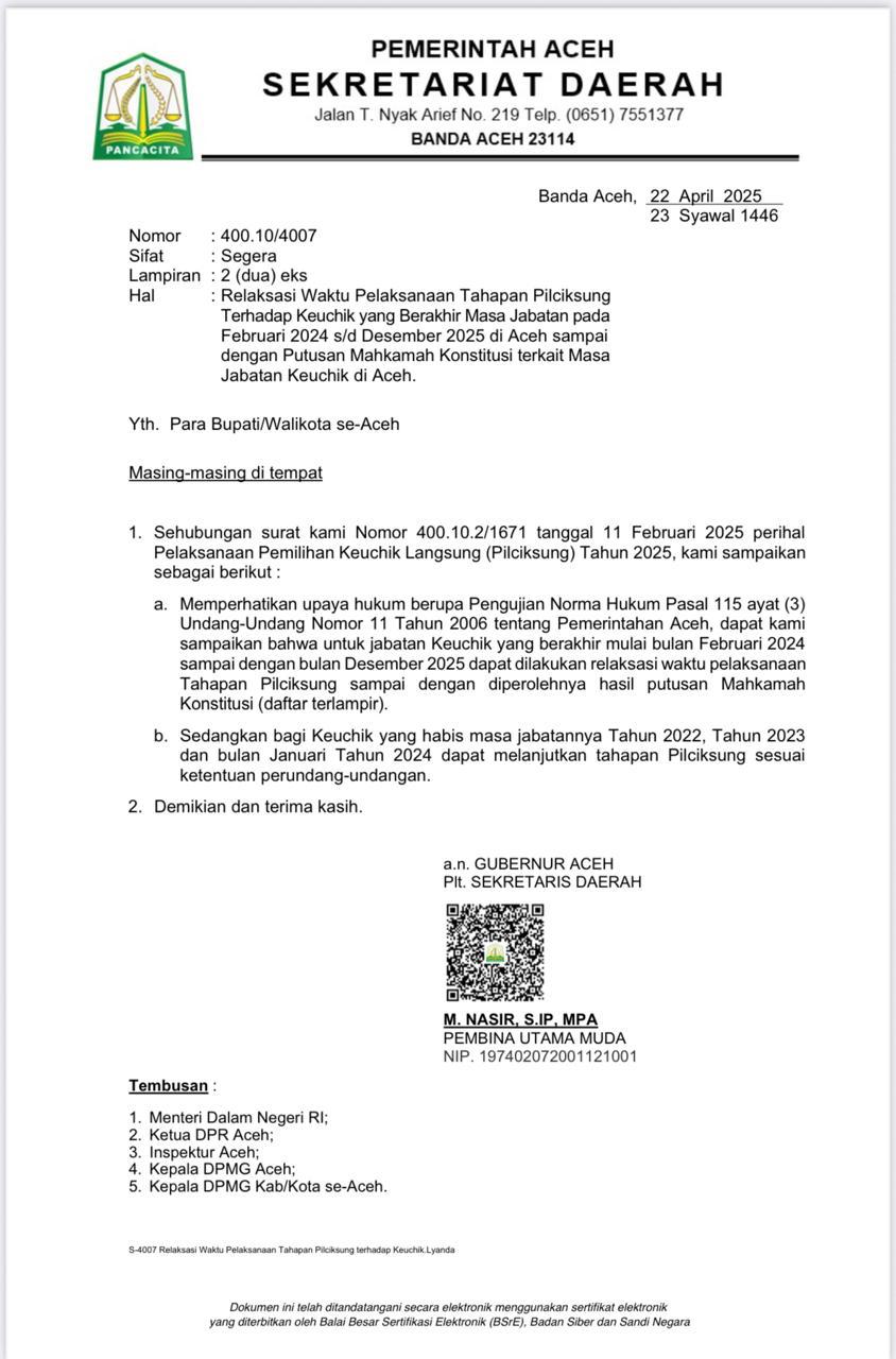 Surat bernomor 400.10.2/1671 tanggal 11 Februari 2025 perihal Pelaksanaan Pemilihan Keuchik Langsung (Pilciksung) Tahun 2025 perihal Relaksasi Waktu Pelaksanaan Tahapan Pilciksung Terhadap Keuchik yang Berakhir Masa Jabatan pada Februari 2024 s/d Desember 2025 di Aceh sampai dengan Putusan Mahkamah Konstitusi terkait Masa Jabatan Keuchik di Aceh Para Bupati/Walikota se-Aceh.