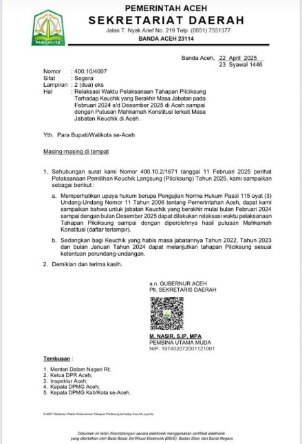 Surat ini ditandatangani oleh Pelaksana Tugas Sekretaris Daerah Aceh, M. Nasir, S.IP, MPA atas nama Gubernur Aceh. Tembusan surat tersebut juga disampaikan kepada Menteri Dalam Negeri RI, Ketua DPR Aceh, Inspektur Aceh, serta Kepala DPMG Provinsi dan Kabupaten/Kota se-Aceh.
