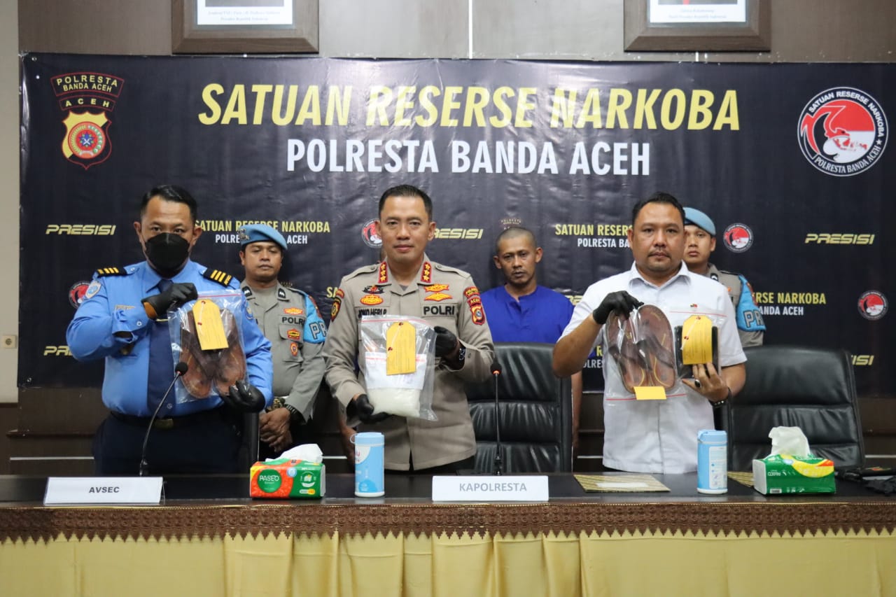“Ada empat paket sabu yang ditemukan dalam sol sandal yang beratnya 900 gram,” ujar KBP Joko didampingi Kasat Resnarkoba, AKP Rajabul Asra dan Vovo Kristanto PGS Airport Security Departement Head Bandara SIM saat konferensi pers di Polresta Banda Aceh, Rabu (30/4/2025).