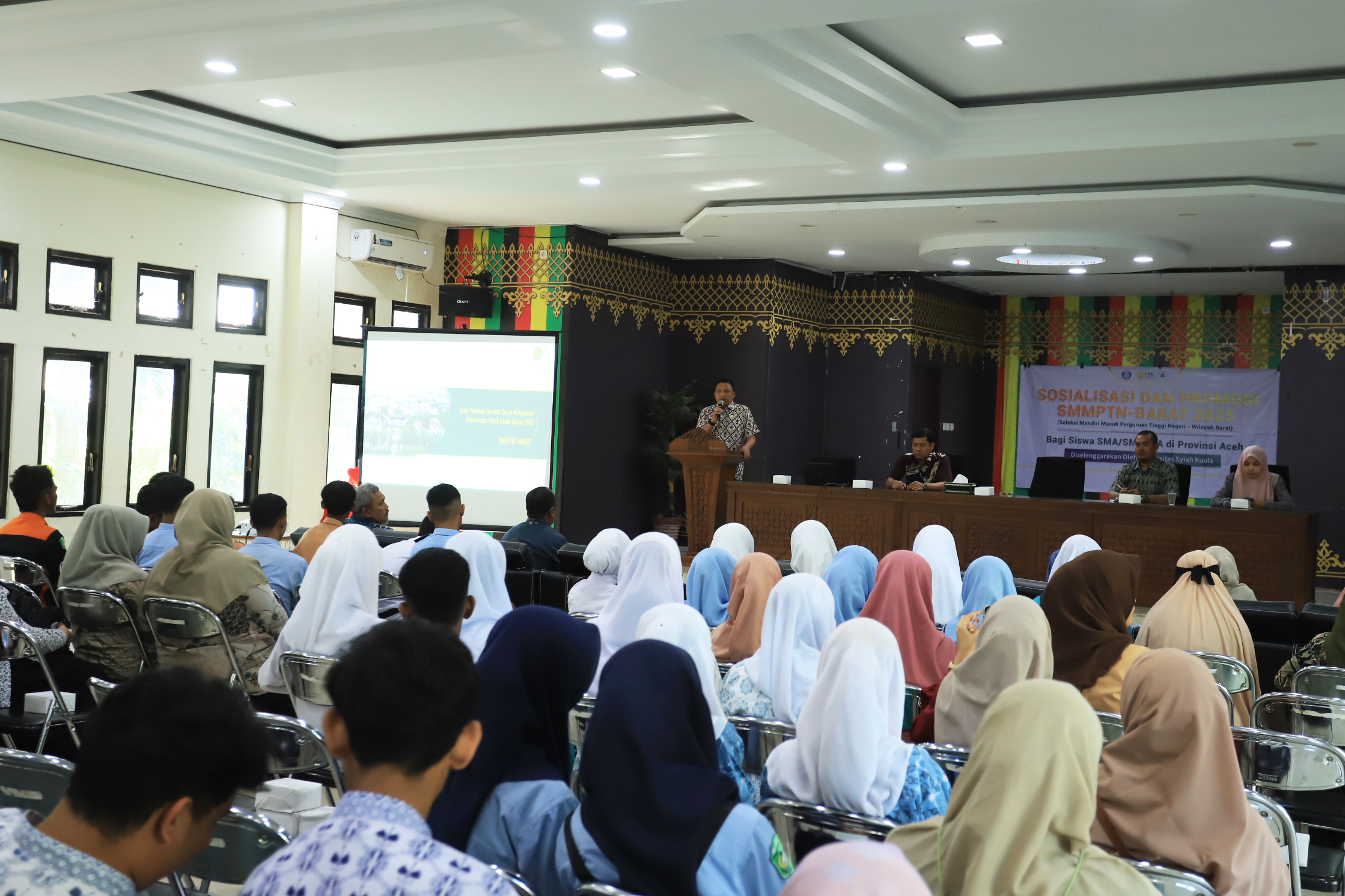 Ratusan siswa-siswi serta guru pendamping dari SMA/MA/SMK atau sederajat di Lhokseumawe, mengikuti dengan seksama sospro tersebut. Dengan pemateri Staf Humas dan Protokol USK, Ibnu Syahri Ramadhan.