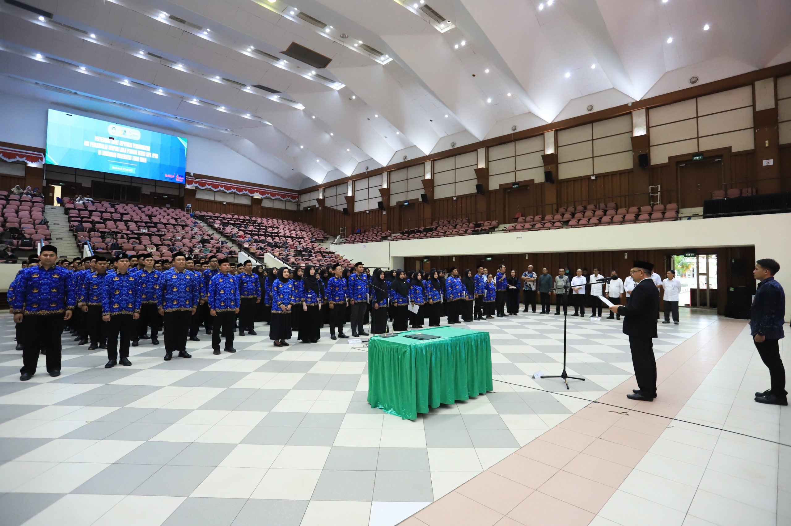 Banda Aceh – Sebanyak 266 Calon Pegawai Negeri Sipil (CPNS) formasi dosen Universitas Syiah Kuala (USK) resmi menerima Surat Keputusan (SK) pengangkatan dan mengikuti prosesi pengambilan sumpah/janji sebagai Pegawai Negeri Sipil (PNS). Kegiatan ini berlangsung di Gedung AAC Dayan Dawood, Darussalam, Banda Aceh, Senin (10/6/2025).