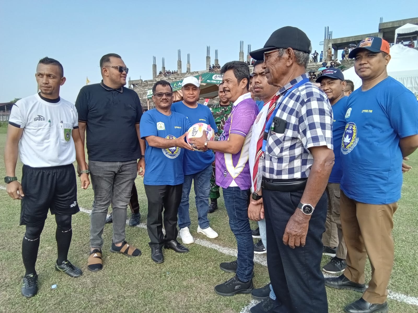 Ketua Asprov PSSI Aceh Nazir Adam, menyerahkan bola kepada Wabub Aceh Tamiang Ismail, SE serta didampingi Waketum Asprov PSSI Aceh, Sekum, Exco, Ketua Askab PSSI Tamiang dan pengurusnya dalam serimoni pembukaan Pra PORA Cabor Sepakbola Grup D di stadion Aceh Tamiang, Selasa (01/07) sore. Foto/Humas PSSI Aceh.