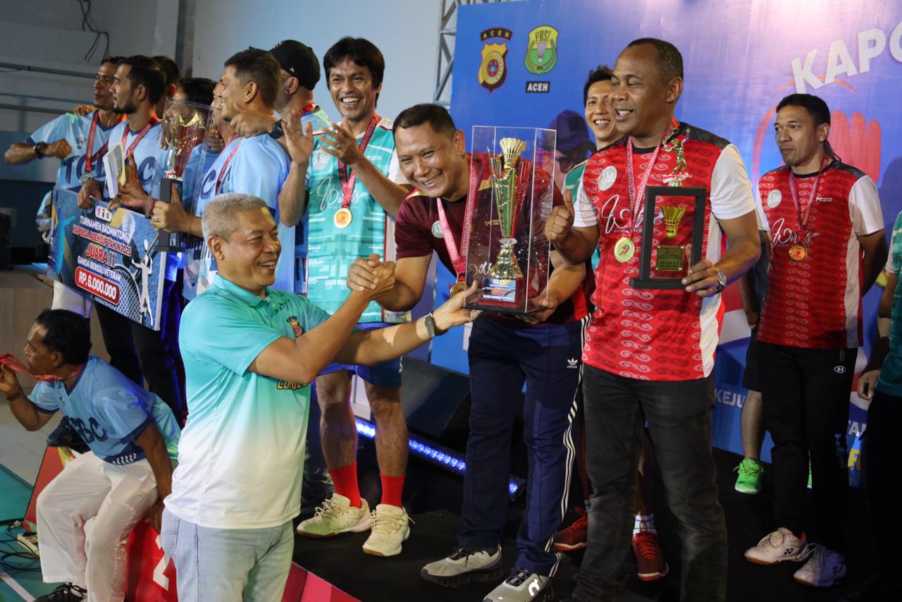 Banda Aceh – Wakapolda Aceh, Brigjen Pol. Ari Wahyu Widodo, secara resmi menutup Kejuaraan Badminton Kapolda Aceh Cup 2025 di Gedung Olahraga (GOR) KONI Aceh, Minggu malam, 27 Juli 2025. Penutupan turnamen ditandai dengan laga final ganda veteran beregu 98 yang menjadi penentu gelar juara.