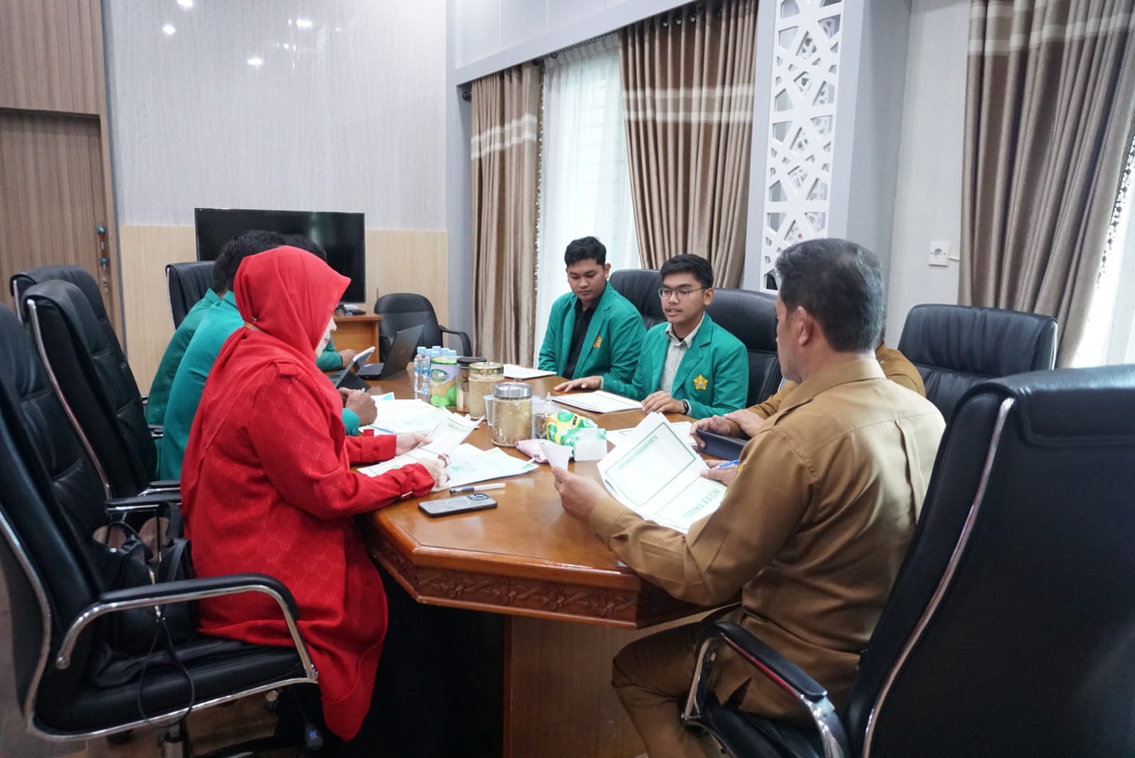 Aceh Besar – Wakil Bupati Aceh Besar Drs H Syukri A Jalil didampingi Asisten I Sekdakab Farhan AP menerima audiensi dari Dekan dan mahasiswa Universitas Syiah Kuala (USK), di Ruang Kerja Wakil Bupati, Kota Jantho, Aceh Besar, Senin (11/08/2025).