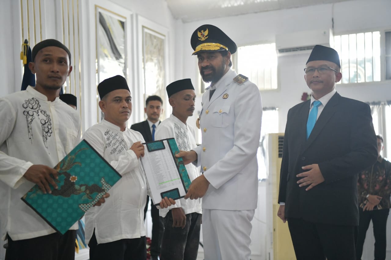 Banda Aceh – Gubernur Aceh, Muzakir Manaf (Mualem), menyerahkan remisi kepada para narapidana dalam rangka peringatan Hari Ulang Tahun (HUT) Kemerdekaan Republik Indonesia ke-80. Kegiatan berlangsung di Lembaga Pemasyarakatan (Lapas) Kelas IIA Banda Aceh, Minggu (17/8/2025).