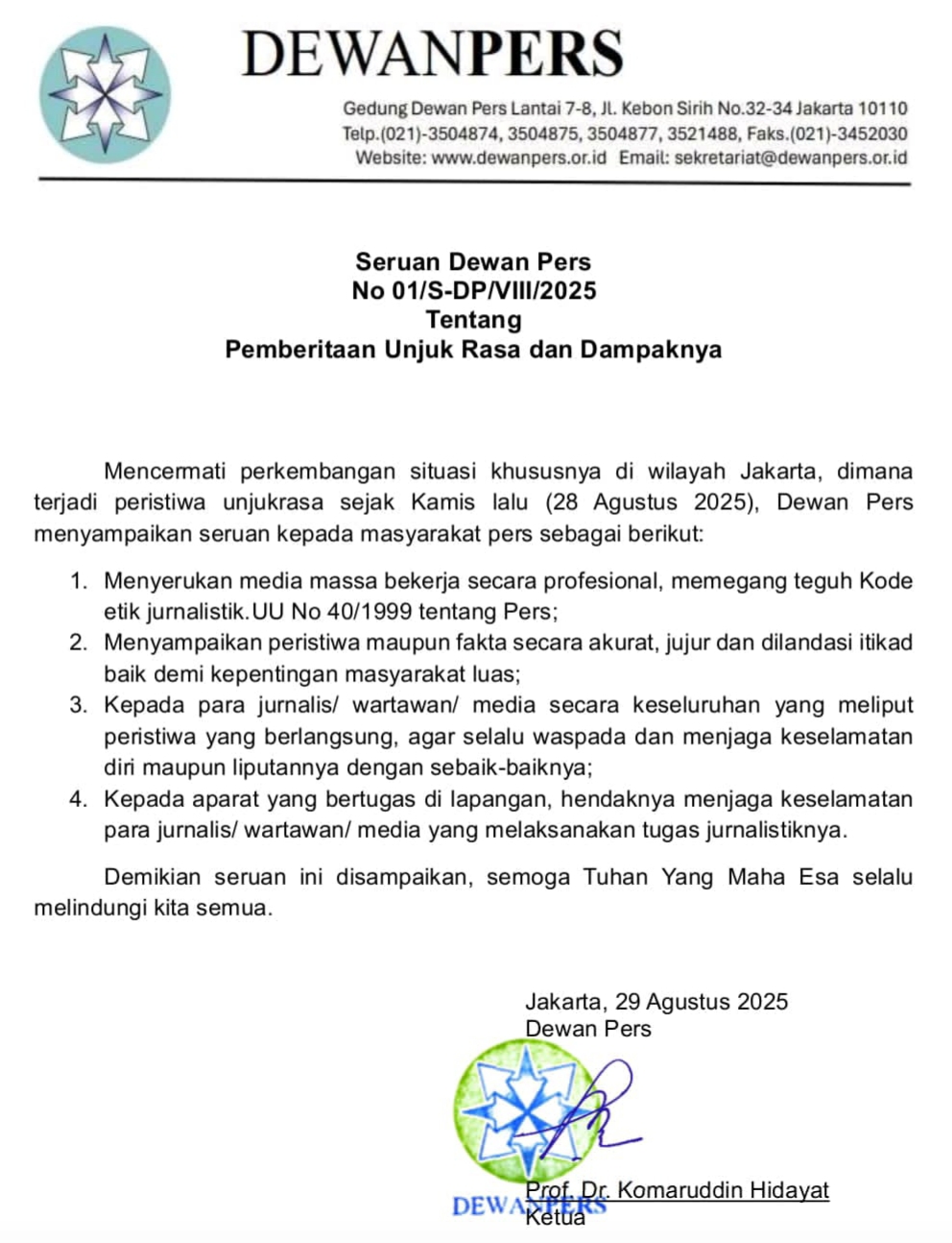 Jakarta – Dewan Pers mengeluarkan seruan resmi terkait perkembangan situasi unjuk rasa yang terjadi di wilayah Jakarta sejak Kamis (28/8/2025). Melalui Seruan No 01/S-DP/VIII/2025, Dewan Pers mengingatkan seluruh insan pers agar tetap profesional dalam menjalankan tugas jurnalistik.