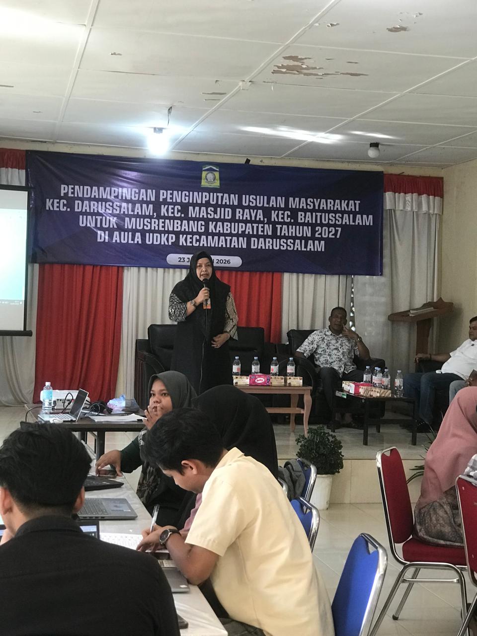 Aceh Besar – Kepala Badan Perencanaan Pembangunan Daerah (Bappeda) Kabupaten Aceh Besar, Rahmawati, SPd, MSi, memberikan pendampingan langsung kepada perangkat gampong dan perwakilan masyarakat dalam proses penginputan usulan pembangunan melalui sistem perencanaan daerah untuk 3 kecataman, meliputi Kecamatan Mesjid Raya, Kecamatan Baitussalam dan Kecamatan Darussalam di Aula UDKP Kecamatan Darussalam, Jumat (23/1/2026).