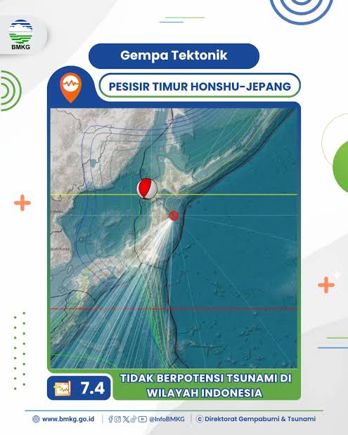 Jakarta – Gempa bumi tektonik berkekuatan magnitudo 7,4 mengguncang pesisir timur Honshu, Jepang, pada Senin (20/4/2026) pukul 14.52 WIB. Meski cukup kuat, Badan Meteorologi, Klimatologi, dan Geofisika (BMKG) memastikan gempa tersebut tidak berpotensi menimbulkan tsunami di wilayah Indonesia.
