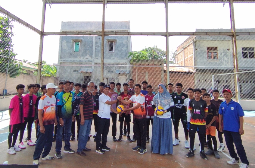 Plt Kadisparpora Aceh Besar Safrizal SSos MSi, menyerahkan bola kepada pihak panitia pada pembukaan Selekda Atlet POPNAS Cabor Voli, di Lapangan Voli JVC Lamsi Daya, Kecamatan Darul Imarah, Kabupaten Aceh Besar, Sabtu (25/4/2026). FOTO: (MC ACEH BESAR).