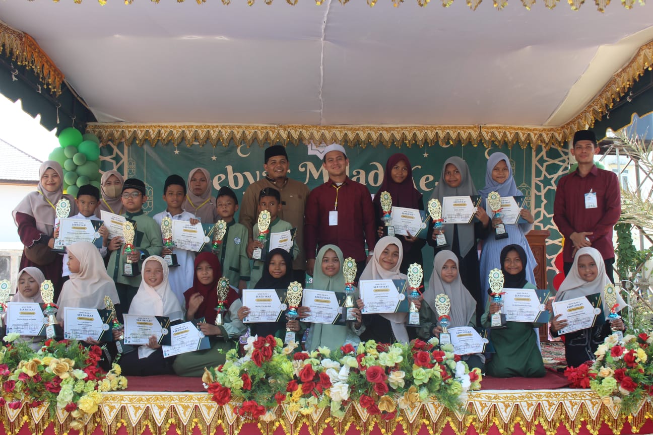 Santri TPQ Babussalam Lam Ujong berfoto bersama usai menerima piala dan sertifikat pada puncak perayaan Milad ke-5 di Gampong Lam Ujong, Kecamatan Krueng Barona Jaya, Aceh Besar, Minggu (26/4/2026). Foto: (TPQ Babussalam Lam Ujong)