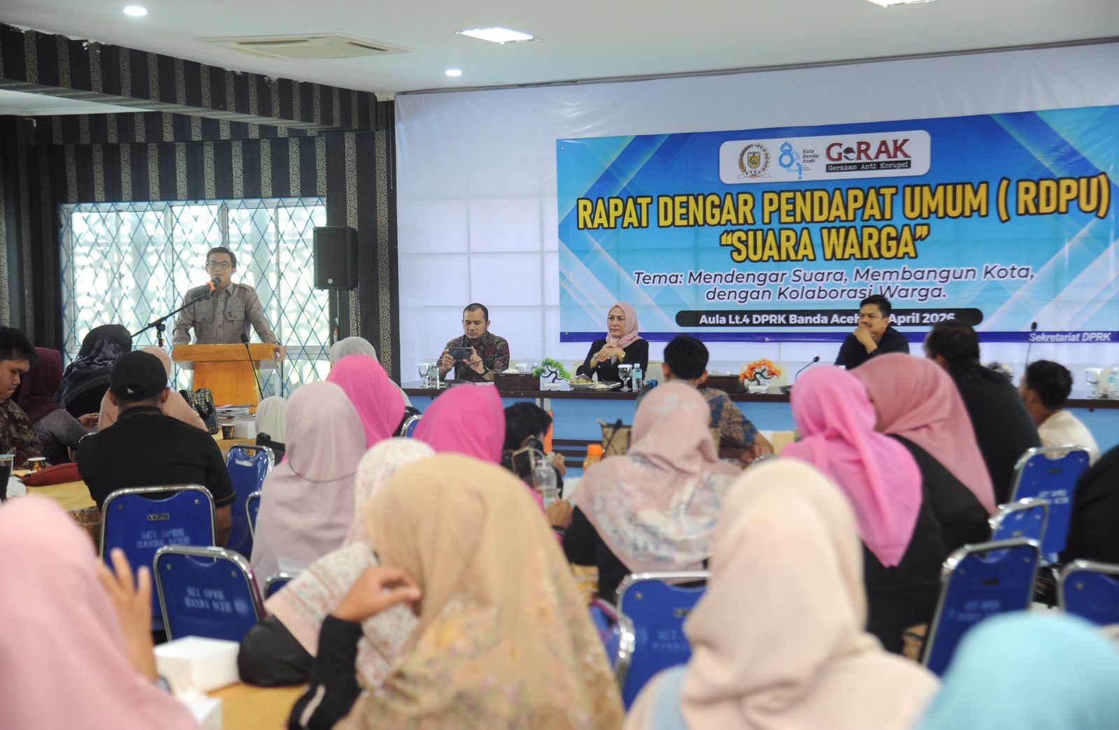BANDA ACEH — Dewan Perwakilan Rakyat Kota (DPRK) Banda Aceh kembali menunjukkan komitmennya dalam memperkuat partisipasi publik dengan menggelar Rapat Dengar Pendapat Umum (RDPU), Kamis (30/4/2026). Kegiatan yang berlangsung di Aula Kantor DPRK Banda Aceh ini mengusung tema “Mendengar Suara, Membangun Kota dengan Kolaborasi Warga”.